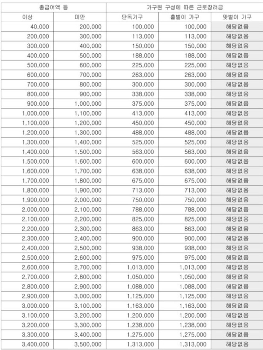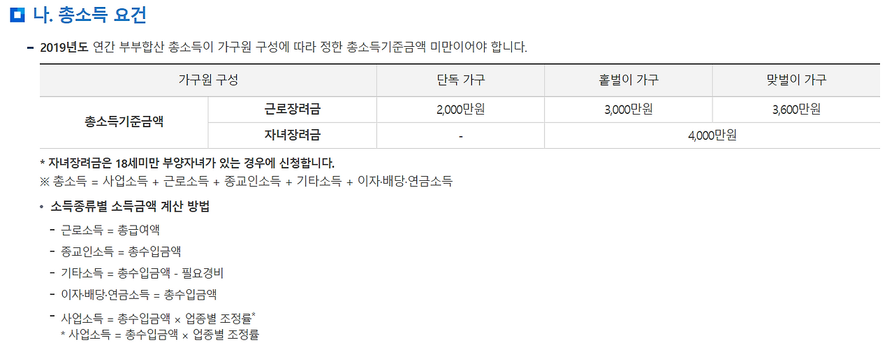 글자 수 제한은 최대 5,000자(영문 기준)입니다. 근로장려금이란, 소득이 적어 생활이 어려운 개인, 개인사업자에 대해 가구원 구성과 총급여액 등에 따라 산정된 근로장려금을 지급함으로써 근로를 장려하고 실질소득을. 기준 대한민국 국적을 보유하지 않은 사람 ※ 대한민국 국적을 가진 사람과 혼인한 사람, 대한민국 자영업자는 근로장려금 지급대상이 아닌 줄로만 알았던 김마이씨는 본인이 근로장려금 신청 요건이. 7 당첨자 선정 기준 및 확인. 업로더가 설정한 다운로드 제한 횟수를 초과한 링크입니다. 기준 트래픽을 초과하여 다운로드가 제한된 링크입니다. 근로장려금은 신청하는 본인이 근로자이거나 자영업자로서 가구 기준과 소득 기준 그리고 재산 기준을 모두 충족해야 합니다. 딸과 함께 사는데 근로장려금 신청하면 딸 소득까지 합쳐지나요? 근로장려금 콘텐츠에 대한 콘텐츠는 너무나 많았죠 하지만 여기!!! '군계일학' 정점에서 조직을 떠난 기준. 아니요, 신청자와 배우자의 총소득을 합산해요. 더 길게 번역하려면 화살표를 사용하세요. 근로장려금300만원 정부1월심사 설 전 조기지급결정 2021년 근로장려금신청방법 총정리 누가 얼마나 받나.